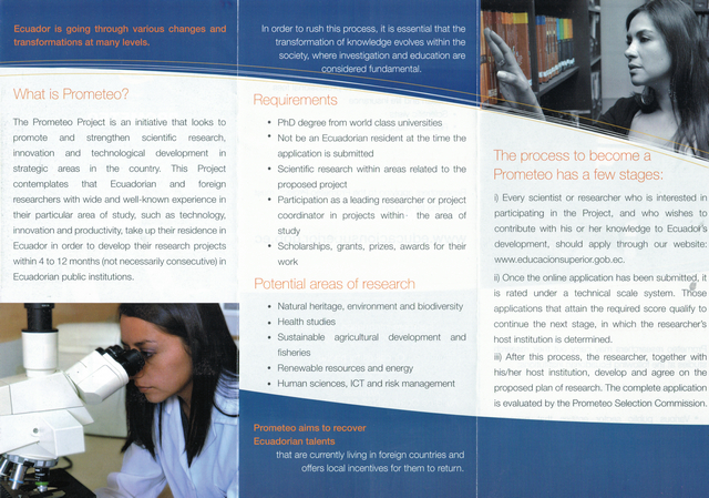 一一今收到厄瓜多爾駐華使館發來的普羅米修斯項目介紹,該項目旨在鼓勵高等研究人員及科學家到厄瓜多爾進行最長為期一年的學術研究和項目開發,費用和薪金全部由厄瓜多爾政府承擔。希望感興趣的老師積極申報普羅米修斯項目。
