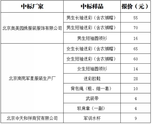 2015年學生軍訓用品中標金額分別為,男生軍訓用品共計196元,女生軍訓用品共計194元。特此公示。