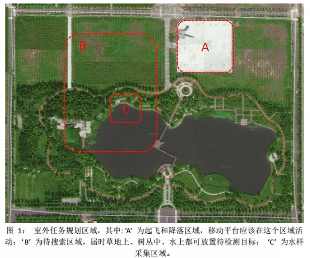 本屆IMAV賽會(huì)比賽分為室外比賽和室內(nèi)比賽兩個(gè)部分。室外比賽主題為“海上鉆井平臺(tái)失火后的搜索與救援”,背景為某海上鉆井平臺(tái)發(fā)生泄漏事故,并引起平臺(tái)局部起火,部分工作人員落入水中。搜救小組趕乘搜索艦船,攜帶無人機(jī)組快速前往平臺(tái)附近執(zhí)行任務(wù)。需要參賽無人機(jī)在移動(dòng)平臺(tái)上自動(dòng)起飛和降落,快速生成目標(biāo)區(qū)域全景圖,采集鉆井平臺(tái)周圍水樣,最后在指定區(qū)域投放救生圈。室內(nèi)比賽主題為“室內(nèi)探測(cè)與搜救”,需要參賽無人機(jī)在室外啟動(dòng),經(jīng)導(dǎo)航至室內(nèi),完成一系列室內(nèi)任務(wù),最后返回起飛地點(diǎn),其間需要無人機(jī)在狹窄空間內(nèi)進(jìn)出,快速生成目標(biāo)區(qū)域全景圖,對(duì)不同物體進(jìn)行辨識(shí)、抓取,并且能移動(dòng)平臺(tái)上平穩(wěn)降落。