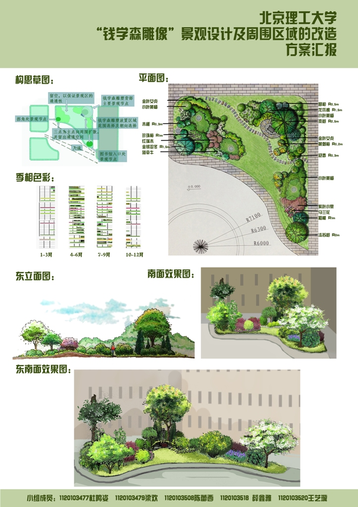 本次展出的方案,作者均為設計學院環境藝術設計系2010級本科生,在專業老師的指導下,學生們將校園景觀改造與城市公共空間景觀設計、植物景觀設計課程學習相結合。在大學生校園景觀需求調研、校園植物分析、錢學森像及周邊環境分析的基礎上,組成七個設計小組分別開展方案設計。所展出的五組方案,通過五個不同方向的設計嘗試——小廣場主題、植物群落主題、微地形主題、時間寓意主題以及思想迸發主題為立意展開錢學森像的遷移改造景觀設計,以求創造美好的校園景觀環境,對北京理工大學的校園景觀改造作出自己的貢獻。