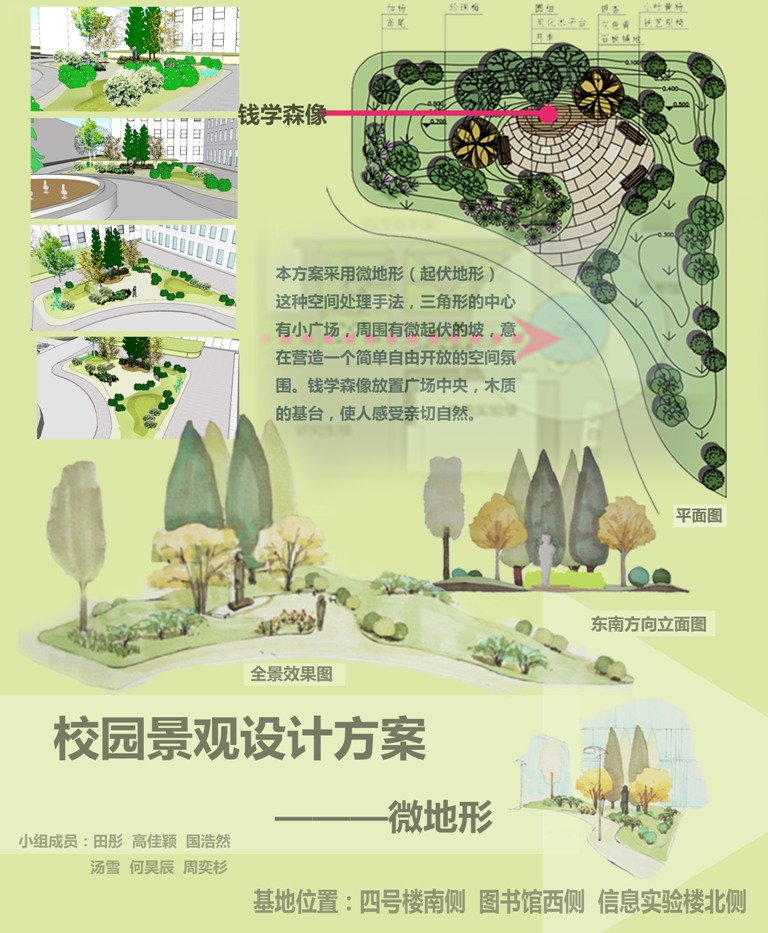 錢學森塑像作為我校校園景觀的重點內容,得到了廣大師生員工的積極關注,黨委宣傳部結合學校整體建設工作開展,擬在圖書館西南三角地重新建設以錢學森塑像為核心的校園景觀,并結合學生教學活動,鼓勵學生用自己的專業知識美化校園,進一步增強校園景觀的文化底蘊,服務于學校的人才培養工作。現將五組方案加以展示,向廣大師生員工征求意見,宣傳部將綜合師生意見后,修改后選定最后的實施方案。