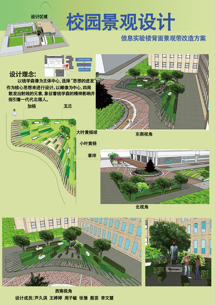為了進一步做好校園環境建設,黨委宣傳部聯合設計藝術學院,以我校錢學森雕塑新址小環境設計為主要內容,將學校工作與學生培養工作結合,積極發揮設計學院環境藝術設計方面的專業力量,組織了本次方案設計活動。