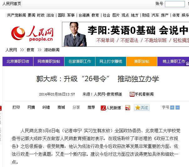 【人民網】北理工黨委書記郭大成:升級“26號令” 推動獨立辦學