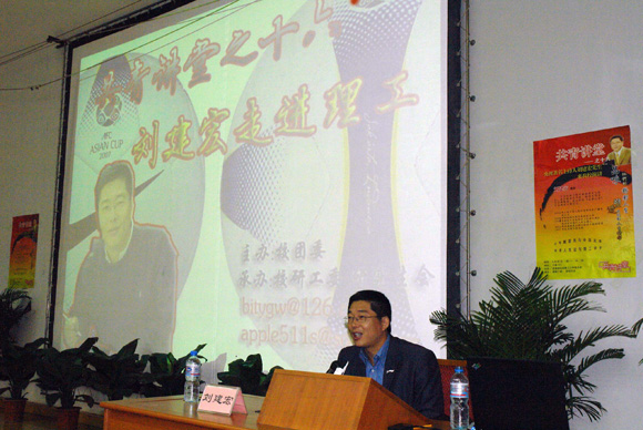 劉先生首先回憶了學生時代和北京理工大學的一些接觸,一下子拉近了與觀眾的距離。他說,他不喜歡居高臨下的講座,喜歡面對面的交流,與其講述自己的心路歷程,倒不如面對面地交談。同學們立刻興奮起來,他們心中有著很多有關于中國足球的問題,需要劉先生解答。
