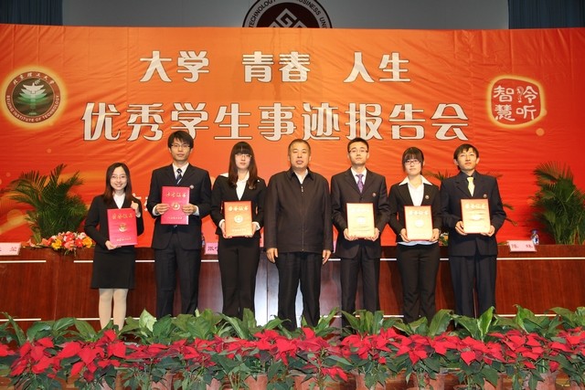 報告會開始前,舉行了簡短而隆重的“領航獎學金”頒獎儀式。學生工作處副處長楊海宣讀了表彰決定,李和章為張堃、臧傳云、張寧博、于滿、李亮、陳姝、鄭瑞琴7名在大學四年全面發展的2010屆優秀畢業生頒獎。