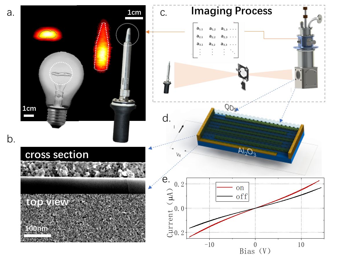 紅外材料和器件的研究是紅外技術發展的核心,實現低成本高性能的紅外探測器是該領域的未來發展方向。然而由于光電效應限制,紅外材料受限于窄帶半導體材料。利用材料的帶內躍遷可以突破紅外光電材料對帶隙的限制,極大拓寬紅外材料的選擇范圍、豐富紅外材料的制備方法,是降低紅外材料于器件成本的有效路徑之一。該工作利用膠體量子點液相合成與加工的優勢,開發了室溫混相配體交換的方法,在量子限域效應下實現高載流子遷移率(~1 cm2/Vs)及導帶內摻雜的精確調控,使帶內躍遷中紅外光電探測器在響應速度上提升1000倍(達到數微秒量級),響應度提升55倍.在黑體輻射下,中波5微米比探測率大于1.7×109 Jones,首次獲得了基于帶內躍遷膠體量子點紅外相機的熱成像,并實現了探測精度0.25 ppm至2000 ppm的CO2氣體傳感器。