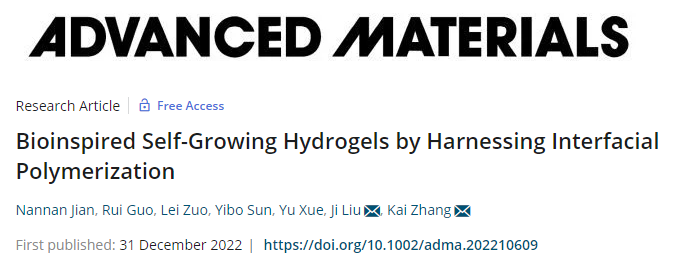 論文詳情:Nannan Jian, Rui Guo, Lei Zuo, Yibo Sun, Yu Xue, Ji Liu*, Kai Zhang*, Bioinspired Self-Growing Hydrogels by Harnessing Interfacial Polymerization. Advanced Materials, 2022: 2210609.