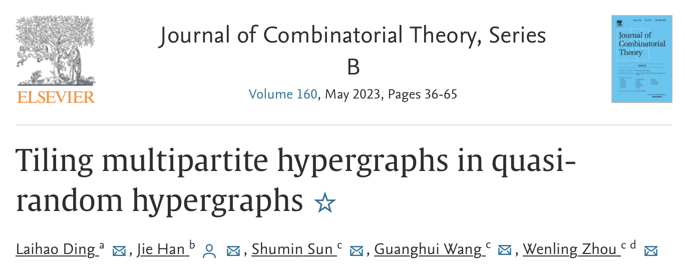 日前,北京理工大學數學與統計學院韓杰教授在國際權威期刊《Journal of Combinatorial Theory, Series B》連續發表題為“Tiling multipartite hypergraphs in Quasi-random Hypergraphs”和“Embedding clique-factors in graphs with low l-independence number”的兩篇研究論文。此兩篇論文研究了具有一定隨機性的圖與超圖中F因子的存在性問題,給出了漸近最優的度條件和密度條件。