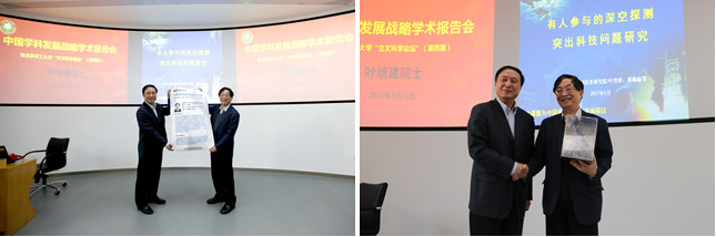 葉培建院士向學校贈送其帶領團隊的最新研究成果—《載人深空探測》書籍,王曉鋒代表學校接收。