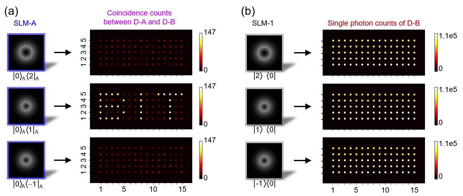 圖1. 高維軌道角動量糾纏量子全息方案示意圖(a)及其測量結果(b)。