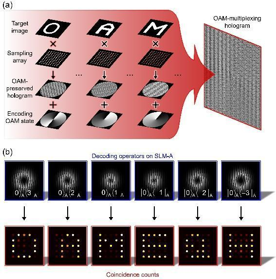 研究人員進一步將多個具有OAM態的強選擇性的全息圖復用在一起,實現了高維OAM復用量子全息技術,大大提升了量子全息攜帶信息的能力。復用方法如圖2(a)所示。設多個目標圖像為字母O,…,A,…,M…。先制作每一個目標圖像的具有OAM態的強選擇性的全息圖。這里需要用不同的OAM態攜帶不同的目標圖像。最后,將所有的OAM選擇性全息圖復用在一起得到OAM復用全息圖。在目標圖像的重構過程中,將OAM復用全息圖加載于SLM-B上,當在SLM-A上加載不同的OAM態的相位全息圖時,即可獲得不同的目標圖像。圖2(b)展示了一個六維情況的實驗結果(這里的六個目標圖像是字母O、A、M、E、Q和H)。這些結果證明了高維OAM復用量子全息的可行性。