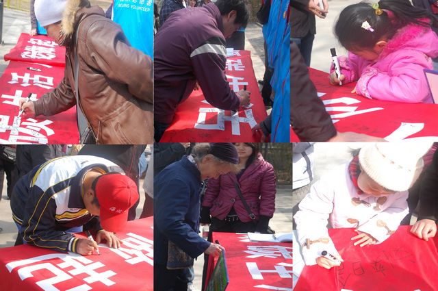 時近正午,條幅上已簽下了滿滿的名字,這次活動也宣告成功圓滿的結(jié)束。此次活動受到了參與者的一致好評。一位姓寧的老人寫到“這個活動非常有意義,以后希望多多搞這個活動,讓家喻戶曉。尤其是讓青年人認(rèn)識到低碳對人類的好處,使人們以后生活在綠色的環(huán)境中”。