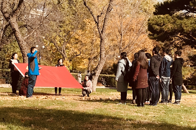 “快看!這兒有個(gè)金色的黨徽!”11月7日上午,秋日的北京理工大學(xué)中關(guān)村校區(qū)內(nèi),從中心花園經(jīng)過(guò)的人群都紛紛拿出手機(jī),記錄著綠色的大草坪上那幅由銀杏葉構(gòu)成的巨型畫(huà)作——一枚金燦燦的黨徽和學(xué)校辦學(xué)遷移路線圖。