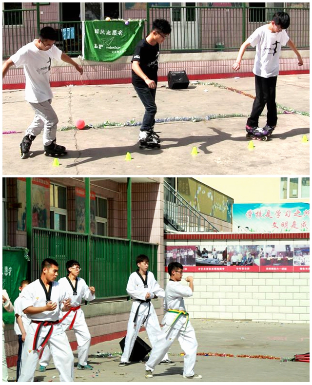 另外,為了給希望學校的孩子們帶來一場不一樣的聯歡會,綠風還特別邀請了北京理工大學“酷愛輪滑社”和“跆拳道協會”來參加我們的六一聯歡會,這兩個節目給會場帶來了高潮,孩子們都被大哥哥大姐姐們精彩的表演所震撼,臺下掌聲雷動,經久不息。