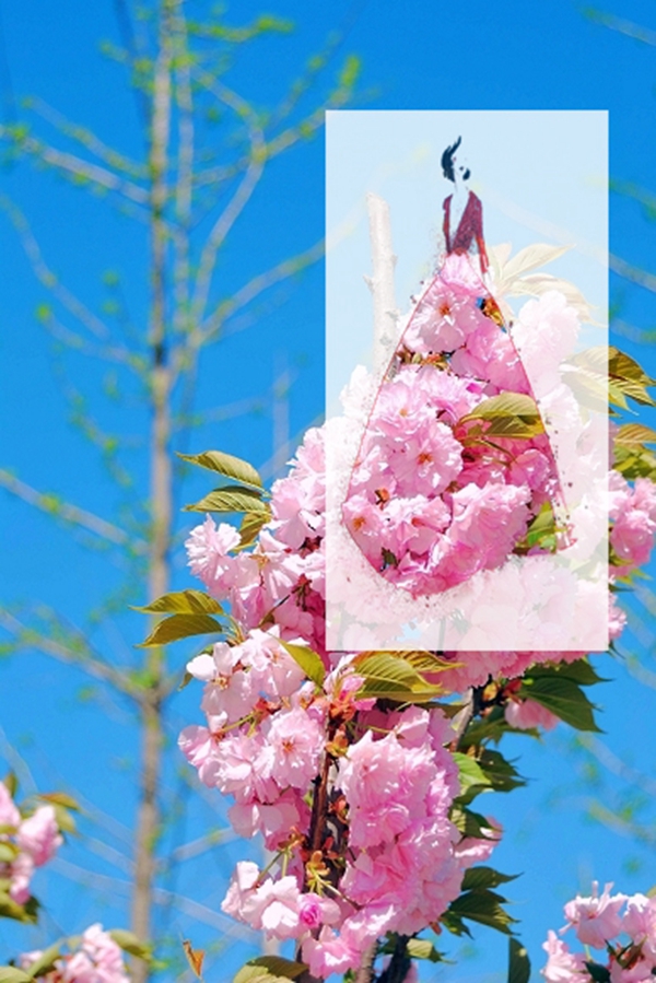 粉色的花朵,嫩綠的枝葉。采花的仙子喜歡這樣的花朵,于是將她這樣的花朵繡于自己的長裙,淡雅優(yōu)美,翩翩起舞。