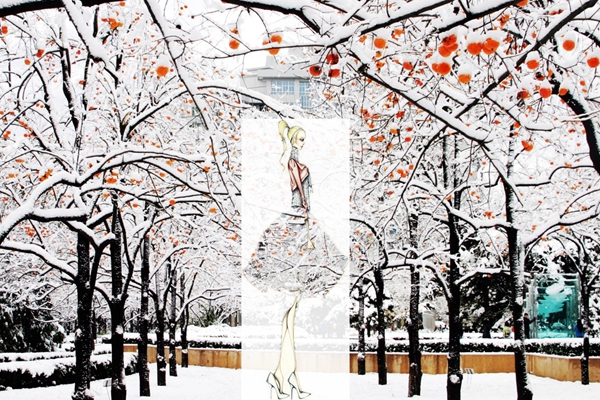積雪的純白,柿子的紅橙,如同樹干上掛著鮮艷的燈籠。南方的孩子一定很少見到雪,而北京近年也很少見到雪。這樣中國風(fēng)式的裙子,在國外的地毯上一定備受矚目。