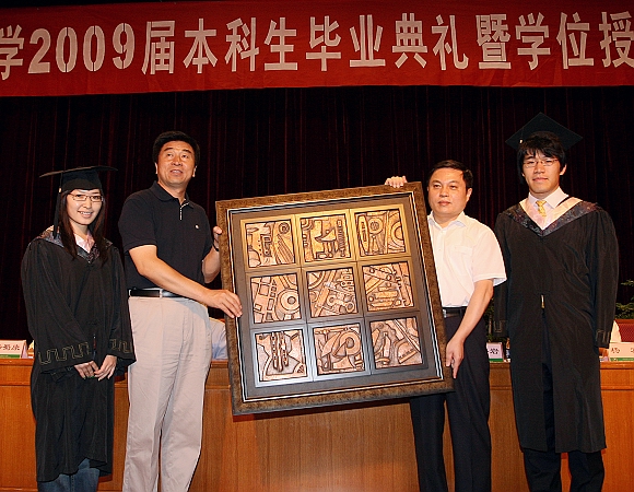 設(shè)計(jì)與藝術(shù)學(xué)院的畢業(yè)生代表向母校贈(zèng)送紀(jì)念品——“敲銅”。這是由9名設(shè)計(jì)與藝術(shù)學(xué)院的畢業(yè)生手工敲制而成,把美好的大學(xué)生活濃縮到9塊銅板畫上,表達(dá)了對(duì)母校的感激與眷戀。郭大成書記、胡海巖校長代表學(xué)校接受紀(jì)念品,并與畢業(yè)生代表合影留念。