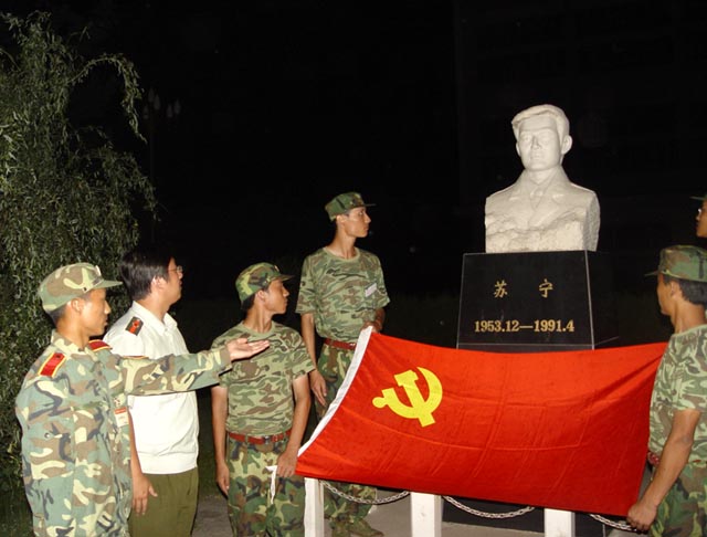 晚間,部分黨員代表請到炮兵指揮學(xué)院教官在蘇寧烈士塑像前介紹英雄事跡