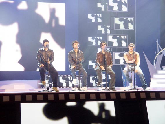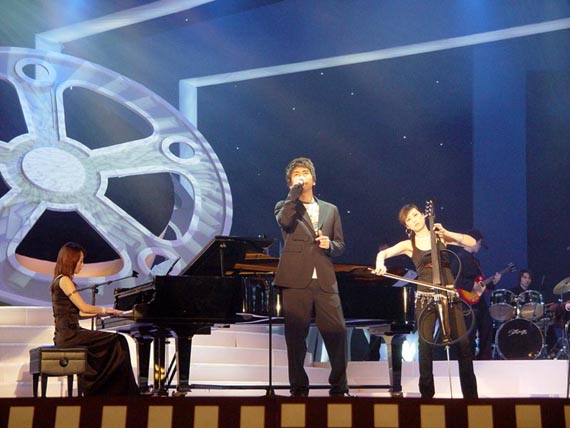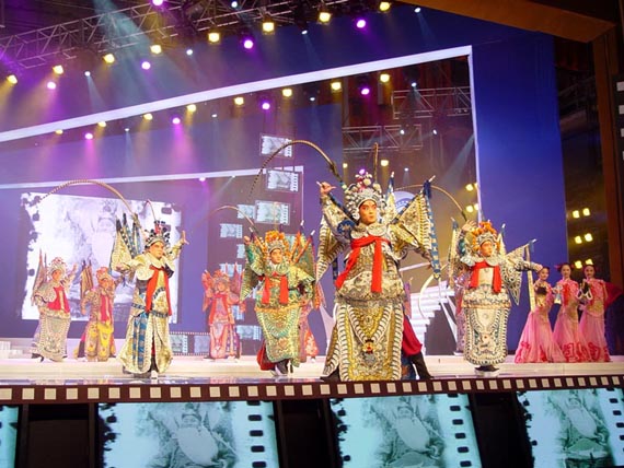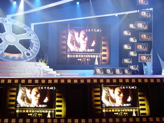 值得一提的是,此次晚會(huì)的舞臺(tái)設(shè)計(jì)極具視覺特色。整個(gè)舞臺(tái)被近60個(gè)等離子顯示屏包裝成電影的“片格”造型,使觀眾仿佛置身于一座夢的工廠。