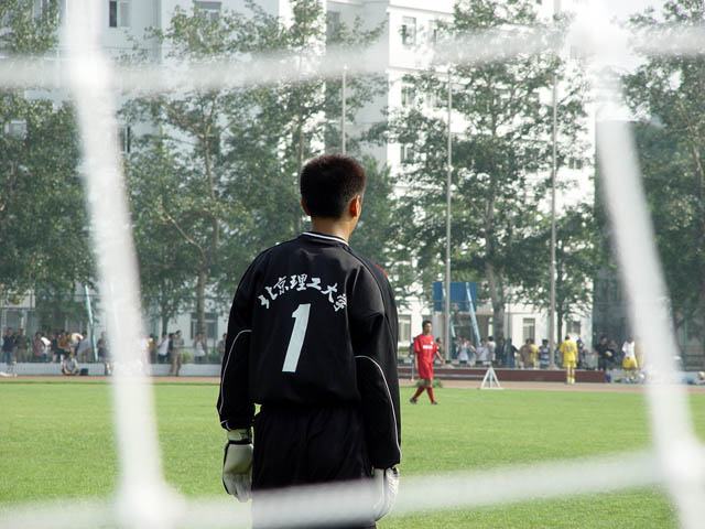 進球后北理開始控制節(jié)奏,在后場頻繁倒腳尋找機會,并不貿(mào)然進攻。相比之下南昌大學在丟球后有些急躁,教練在場邊也不時要求隊員積極跑動。不過面對穩(wěn)扎穩(wěn)打的北理,他們并沒有得到太好的進攻機會。17分鐘,北理7號李爽再次在前場斷球并迅速低平球傳入禁區(qū),但南昌大學的后衛(wèi)這次表現(xiàn)穩(wěn)健,他將球順利攔下并立即長傳前場,前場球員拿球后邊線突破,他的傳中被北理后衛(wèi)斷下,沒有形成威脅。后面的比賽一直是北理掌握著主動權(quán),頻頻在南昌大學的門前制造威脅。22分鐘,北理發(fā)出一記內(nèi)旋任意球被對方門將得到;25分鐘,北理左側(cè)發(fā)出角球,南昌大學門將出擊沒能把球打遠,北理球員跟進一腳遠射被后衛(wèi)擋出;32分鐘,北理9號王晟宇接隊友傳中,順勢在空中一個漂亮的獅子甩頭,可惜球被門將得到。37分鐘,南昌大學終于得到反擊機會,8號張小宇帶球突入禁區(qū),遺憾的是最后一腳沒有控制住,球被門將得到。46分鐘,上半場比賽結(jié)束,北理暫時以1:0領(lǐng)先。