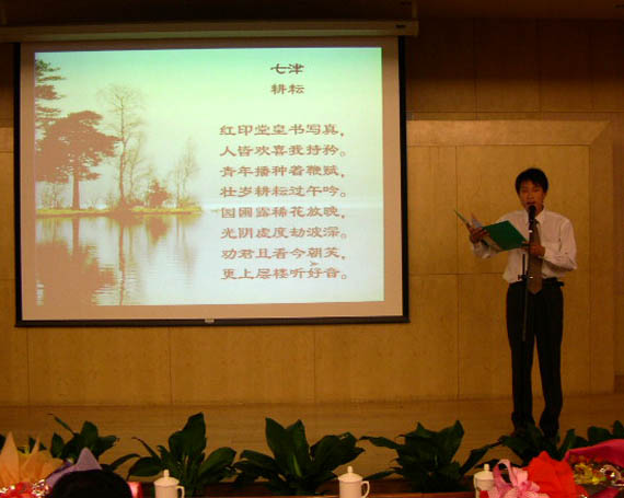呂老師詩集分為松梅竹菊蘭五篇,松以言志,梅敘求學,竹詠時政,菊寫景物,蘭抒情懷,五位年輕的班主任代表全院師生朗誦了其中的部分詩詞,他們的朗誦不僅聲情并茂,而且將自己的情感真正融入到了詩詞與音樂中,在座師生深受感染。