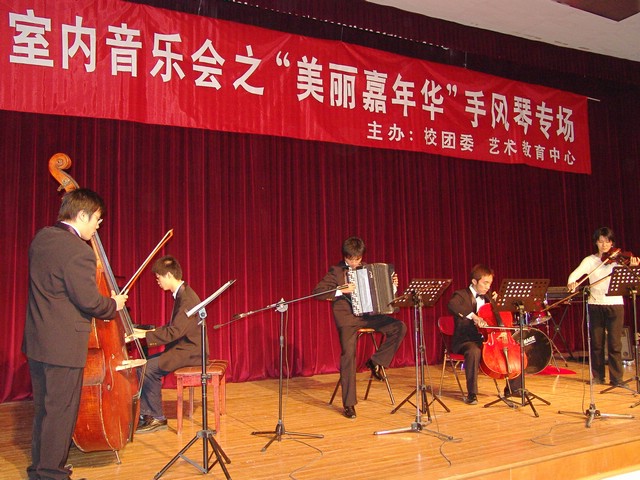11月23日晚,2005年“秋之韻”系列音樂(lè)會(huì)手風(fēng)琴專場(chǎng)演出在中心教學(xué)樓一層報(bào)告廳舉行。音樂(lè)會(huì)在優(yōu)美的手風(fēng)琴合奏《美麗嘉年華》的旋律中拉開(kāi)了帷幕。