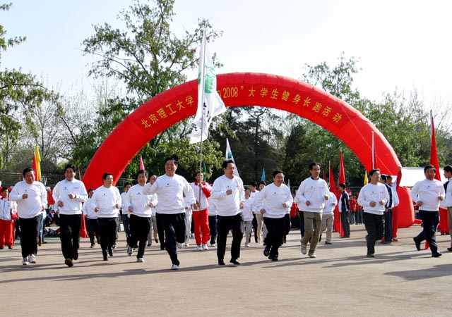 我校“奔向2008”大學生健身長跑活動起跑儀式在東操場舉行,這是我校以實際行動迎接、參與2008奧運會,對師生體質水平、運動水平的一次大檢閱。北京市體美處甘北林處長和白榮正副處長、北京市大學生體育協會教學群體部張威教授、張雅云教授和曹兵教授以及來自10所北京高校體育部領導(北外、財經、中青政、人大、清華、北大、民大、北航、首師大、工商)和離退休體育老教師出席了起跑儀式,觀看了精彩的開幕式。為響應北京教委、奧組委、團市委、教工委的號召,積極參與奧運、服務奧運、健康奔向2008,我校制定了詳細的計劃,從現在到2008年8月8日,參加活動的學生和班級將跑完2008公里,同時開展奧運知識教育和誠信教育,發揚奧林匹克精神,以此來增強大學生的身心素質,積極參與健身,增進大學生對奧運精神的理解,以實際行動支持奧運,增進大學生對體育衛生知識的理解,培養和提高學生的誠信意識。校黨委書記焦文俊為健身長跑活動致詞,校長匡鏡明鳴槍發令,校黨政領導李志祥、楊賓、侯光明、趙平、趙長祿、楊樹興、孫逢春、張維維、趙顯利、各部處學院領導和1300名大學生奔跑起來,將活動推向高潮,我校“奔向2008”大學生健身長跑活動正式拉開了序幕。