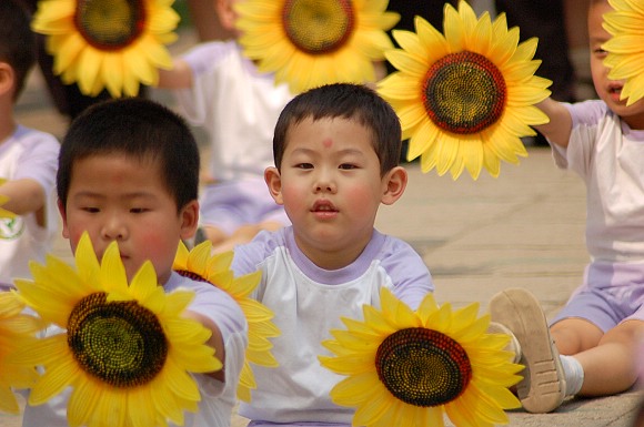 中班小朋友也為大家表演了體操“葵花娃娃”,葵花朵朵就像孩子們張張可愛的笑臉。