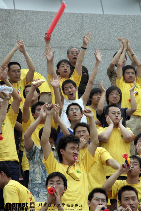 為了營造熱烈的主場氛圍,機械與車輛工程學院組織1200多名同學為主隊吶喊助威。與場上我校足球隊橙色隊服相應,同學們身著黃色T恤衫,手持活力棒、喇叭、口哨等道具為我校足球隊加油。