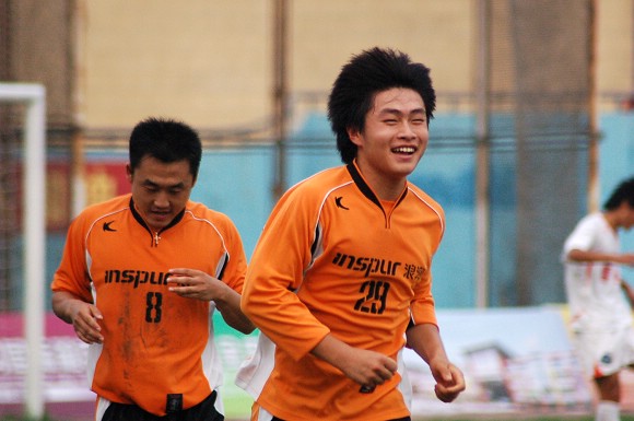 剛剛換上場的29號年輕球員秦陽在門前候個正著,抬腳勾射將比分鎖定了3-0的比分。