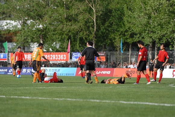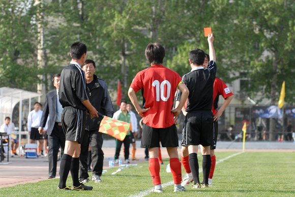 但僅過了7分鐘,延邊隊2號同樣由于危險動作,也被紅牌罰出場外。為此,延邊隊主教練還上來與邊裁發生了爭執,險些被罰出場外。接下來的比賽,雙方的失誤都明顯增多,火藥味也濃了起來。最后學生軍憑借頑強的精神,將1:1的比分保持到了終場,雙方握手言和。