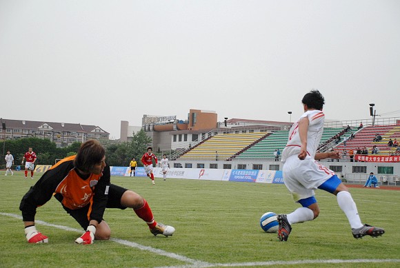 開場后雙方都打的比較積極,但是相對來說上海七斗星隊的進攻速度比較慢,拼搶反而不如愛國者大學生隊勇猛。在雙方試探性的打了10分鐘以后,比賽漸漸加快了節奏,第18分鐘,上海隊獲得任意球機會,但是并沒有形成威脅,第25分鐘,上海隊發動進攻,左路突破傳中,中路接應的上海球員橫敲,但是在最后射門的一剎那沒有打好,被愛國者大學生門將王毅奮力撲出。