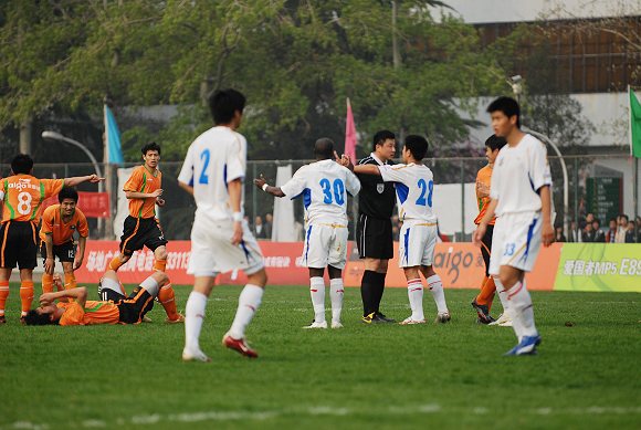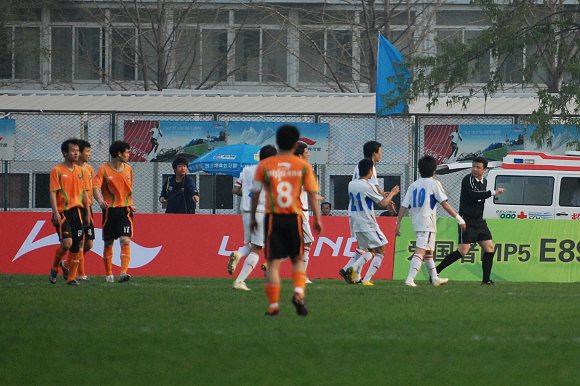 第27分鐘,四川隊的10號在前場的拼搶中犯規,吃到了本場比賽的第一張黃牌。由于雙方的隊員都很年輕,盡管場上的經驗不足,但在場上的拼搶十分激烈,所以場面上人仰馬翻的場面屢屢出現。