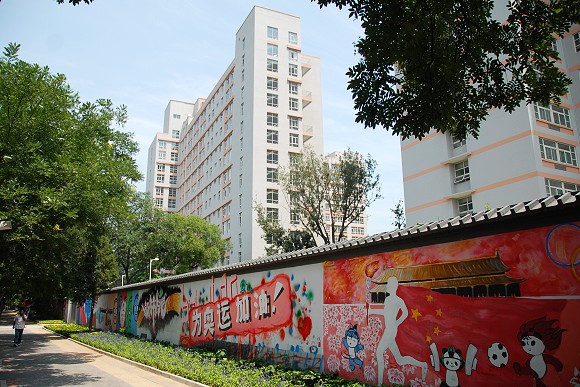 內(nèi)容豐富、創(chuàng)意十足的奧運涂鴉與整潔的校園建筑交相輝映。