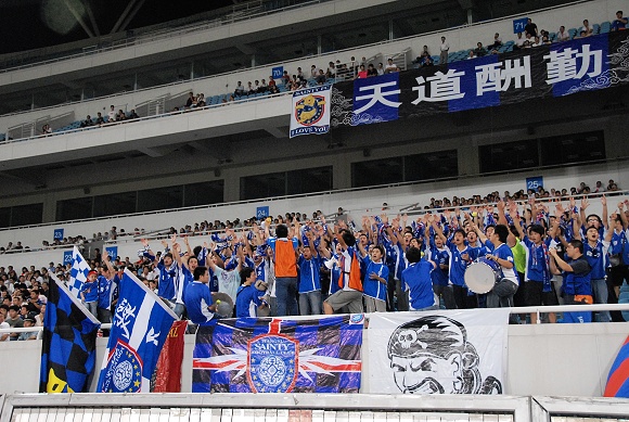 贏球了,球迷也開心,現場看球的球迷喊出了“舜天沖超、中秋快樂”的心聲。