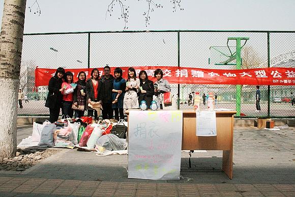 2009年3月17日至3月18日,外國語學(xué)院飛愿志愿者協(xié)會(huì)在我校新食堂對面舉辦了“冬日暖陽”首都高校大型衣物捐贈(zèng)公益活動(dòng)。