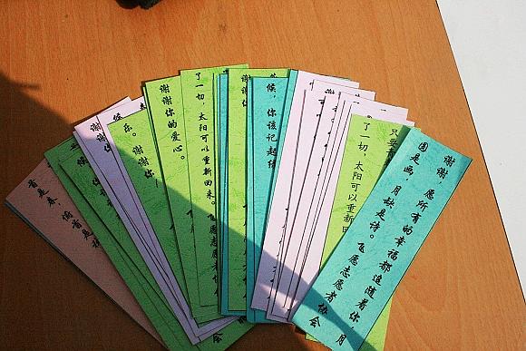 飛愿志愿者協(xié)會(huì)也精心制作了愛心小書簽,并將書簽贈(zèng)送給每位捐衣捐物的師生。正如當(dāng)天二十三度的高溫一樣,大家的熱情持續(xù)高漲。