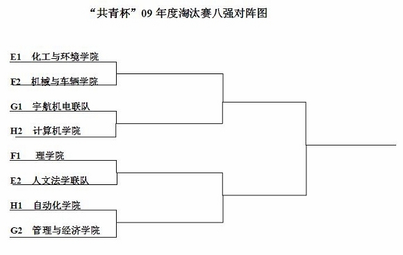 15:00小組賽比賽全部結束,化工與環境學院、人文法學聯隊、理學院、機械與車輛學院、宇航機電聯隊、管理與經濟學院、自動化學院、計算機學院等八支球隊順利晉級。相信他們淘汰賽中會有更精彩的表現。小組賽積分統計與淘汰賽對陣陣型如下,敬請同學們繼續關注“共青杯”精彩賽況。