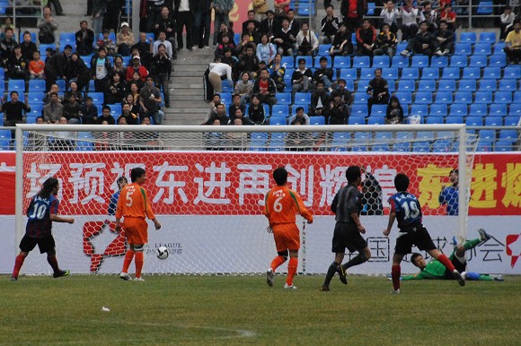 失球之后,東進隊開始猛攻,第9分鐘,外援萊昂納多一腳遠射,被北理工門將孫程撲出。1比0領先之后,北理工明顯開始了收縮防守,東進隊開始圍攻對手。16分鐘,東進隊外援萊昂納多帶球突入禁區獲得單刀球,但可惜射門被對方門將擋出。隨后一次進攻,沈陽東進隊獲得一個角球,東進隊巴西后衛保羅后點頭球攻門,稍稍偏出。猛攻一陣之后,兩隊更多的是在中場進行爭奪,場面比較混亂。