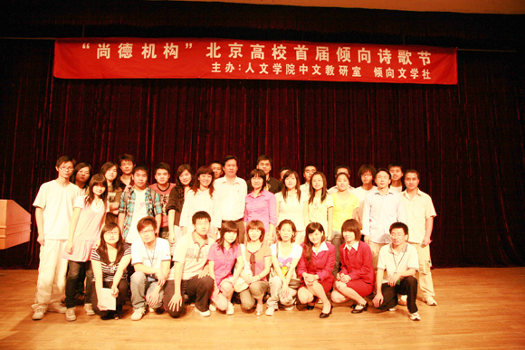 5月10日下午,由我校人文學院中文教研室和傾向文學社主辦的“尚德機構(gòu)”北京高校首屆傾向詩歌節(jié)頒獎典禮在中心教學樓報告廳成功舉辦。我校設(shè)計與藝術(shù)學院黨委書記楊海濱、校報、新聞網(wǎng)執(zhí)行主編段煉、人文學院中文教研室主任姜楠副教授、《現(xiàn)代教育報》周刊部門主任張喬生、著名詩人藍藍、詩人安琪、青年詩人子禾等參加了頒獎典禮,到場的還有北京大學五四文學社、清華大學火石新詩社、北京師范大學五四文學社、中國農(nóng)業(yè)大學摯友社、中央民族大學朱貝骨詩社、中央美術(shù)學院空白詩社等多個高校文學社團。