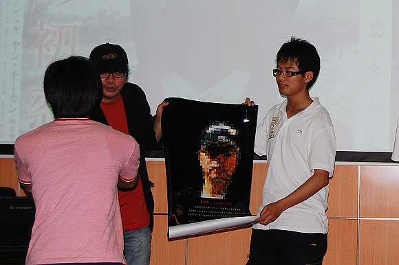 最后同學(xué)們送給章導(dǎo)一副原創(chuàng)的印有章導(dǎo)照片的宣傳畫,其中人物影像是由章導(dǎo)系列作品中的分鏡頭拼成的,章導(dǎo)非常高興,也送給紅河影碟作為禮物,并與同學(xué)們達(dá)成一個美好的約定,章導(dǎo)系列電影音樂欣賞演奏會將在理工大學(xué)進行首演。