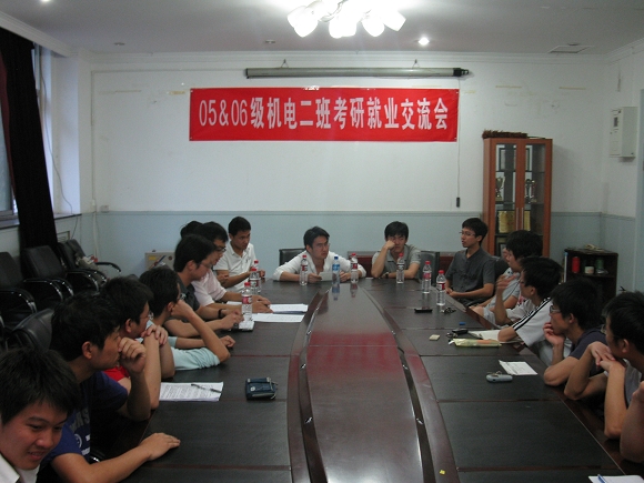 為了讓即將邁入大四的同學對考研和就業有一個更加深刻的認識,6月6日,本科生06級機電二班在三號樓一層會議室召開了主題班會。05級機電二班李北國等六位學生代表出席了會議。