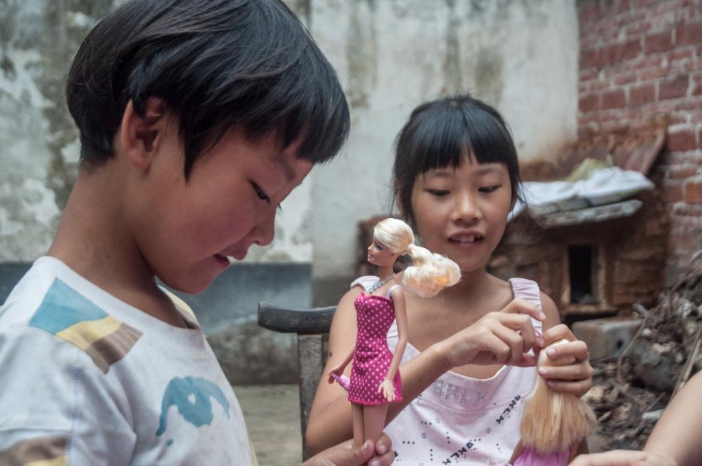 張晨曦(右)和妹妹晨露在玩芭比娃娃