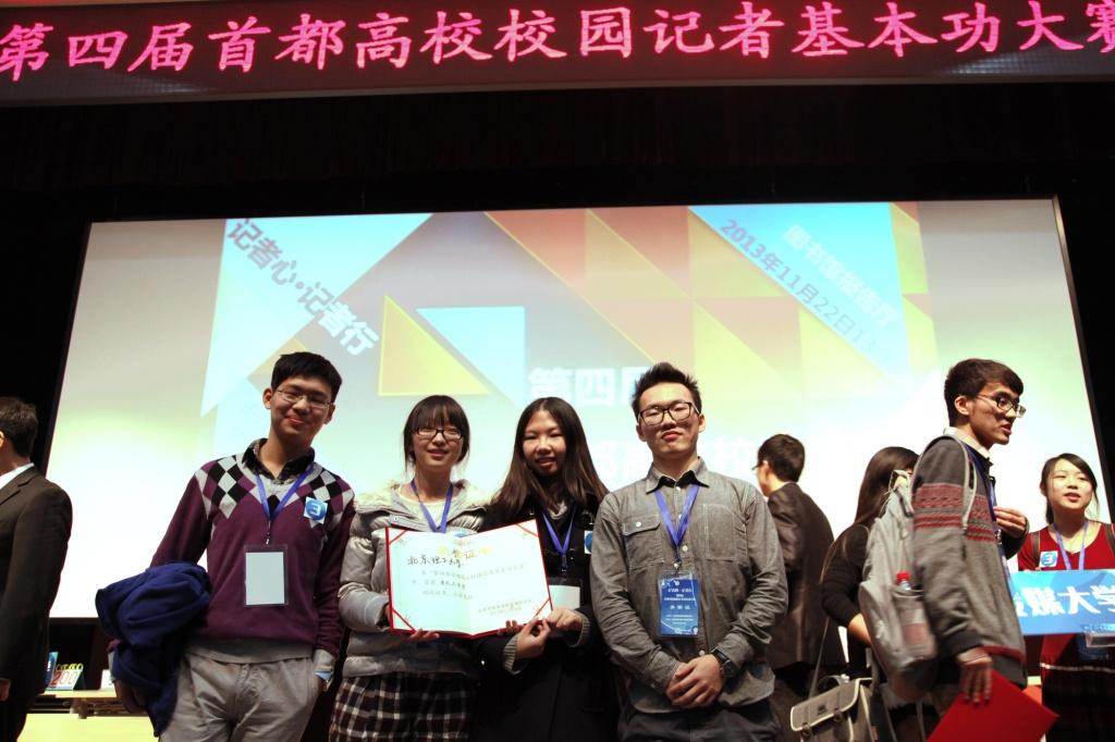 2013年11月23日下午,為了深入貫徹黨的十八大精神和全國宣傳工作會議精神,提高高校記者的基本能力和基本素質,培養高校記者的思維能力和應變能力,第四屆首都高校校園記者“記者心•記者行”基本功大賽在對外經貿大學圖書館拉開了帷幕,來自中國傳媒大學、北京師范大學、中國政法大學等15所首都高校應邀參加了此次比賽。我校大學生記者團記者喻典(2011級材料學院)、胡金璐(2012級外國語學院)、朱彧良(2012級機械與車輛學院)、高月桐(2012級光電學院)在黨委宣傳部指導老師楊揚的帶領下首次參加首都高校記者基本功大賽,并榮獲“團體二等獎”。
