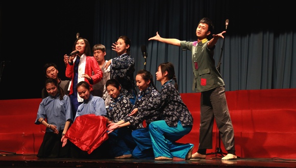 歌詠比賽在表演唱《紅梅贊》中拉開帷幕。在“我愛你中國”、“救亡與解放”、“追尋中國夢”三個(gè)篇章中,進(jìn)入決賽的12支隊(duì)伍相繼演唱了《唱支山歌給黨聽》、《歌唱祖國》等經(jīng)典愛國歌曲,各參賽隊(duì)以聲情并茂的演唱,熱情飽滿的精神面貌,豐富多彩的舞臺(tái)造型以及富有新意的場景表演贏得了在場觀眾一陣陣熱烈的掌聲,同時(shí)也贏得了到場評委的一致好評。篇章之間,我校大學(xué)生藝術(shù)團(tuán)還表演了紀(jì)念毛澤東同志誕辰120周年的原創(chuàng)舞蹈《東方紅》及詩朗誦《追夢青春》。